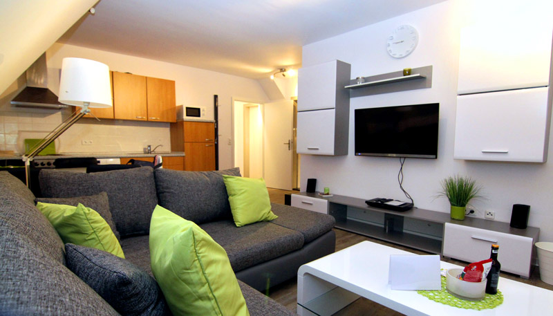 1 kombiniertes Wohnzimmer mit Flatscreen und Blue Ray Player, französischer Balkon mit Tisch und zwei Stühlen. Integrierte Küche mit Essecke, Elektroherd, Backofen, Kühlschrank, Geschirrspüler, Kaffeemaschine und Kaffeekapselautomat , Toaster, Wasserkocher, Mikrowelle. Tageslichtbad mit Dusche und Fön.